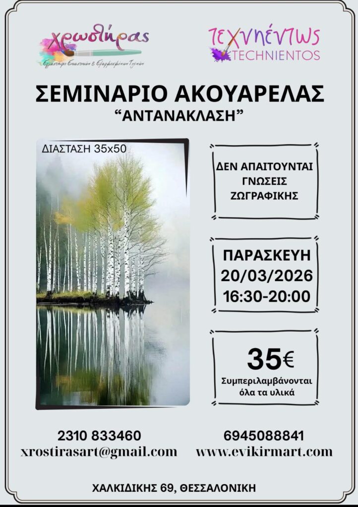 ΠΑΡΑΣΚΕΥΗ 20 ΜΑΡΤΙΟΥ του 2026 στις 16:30-19:30 ΝΕΟ ΣΕΜΙΝΑΡΙΟ ΖΩΓΡΑΦΙΚΗΣ με την ΤΕΧΝΙΚΗ της ΑΚΟΥΑΡΕΛΑΣ