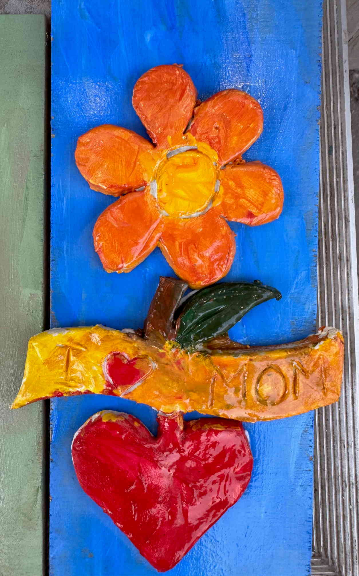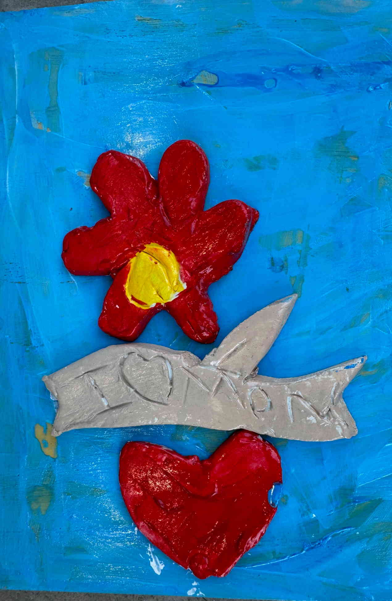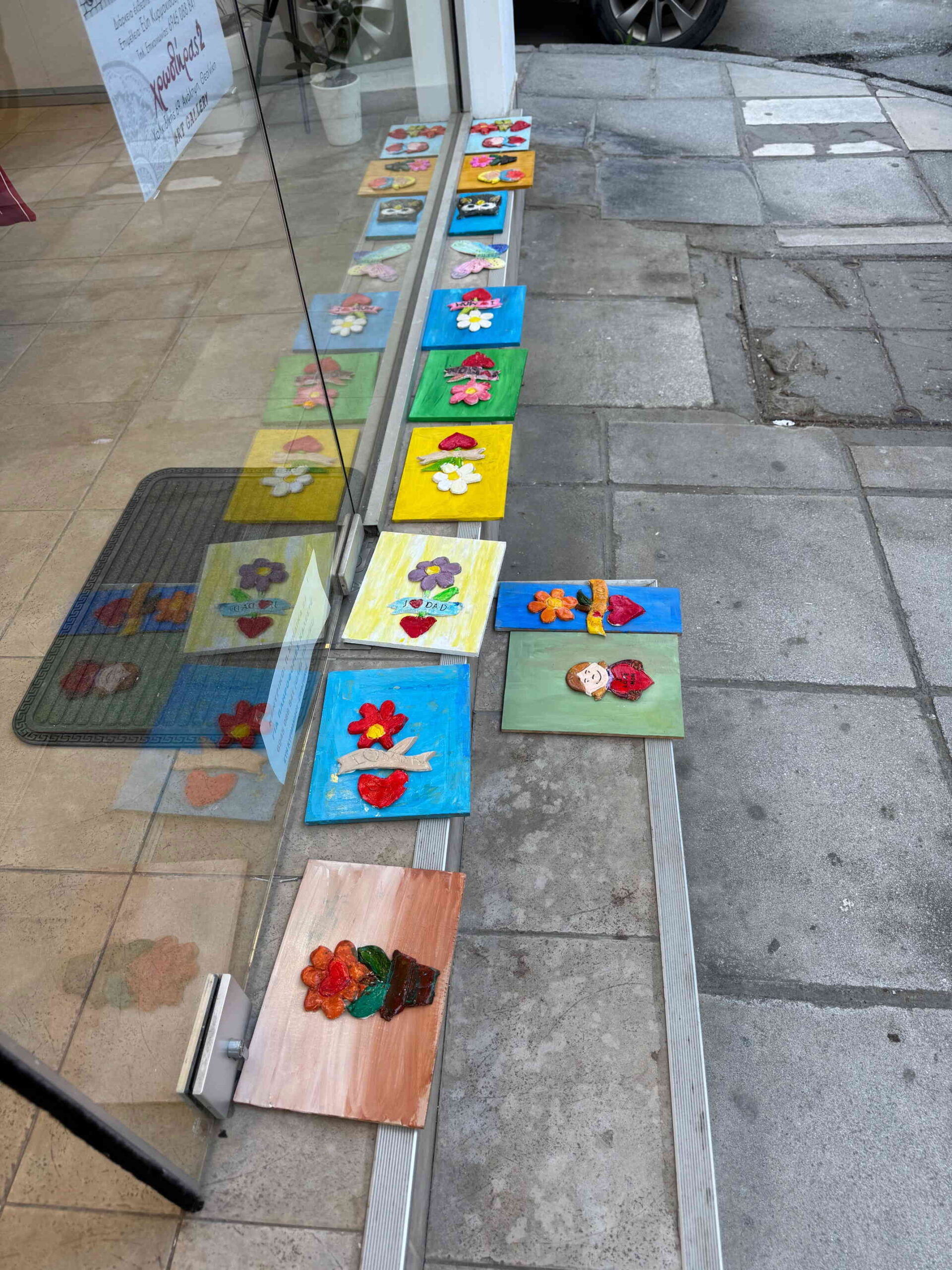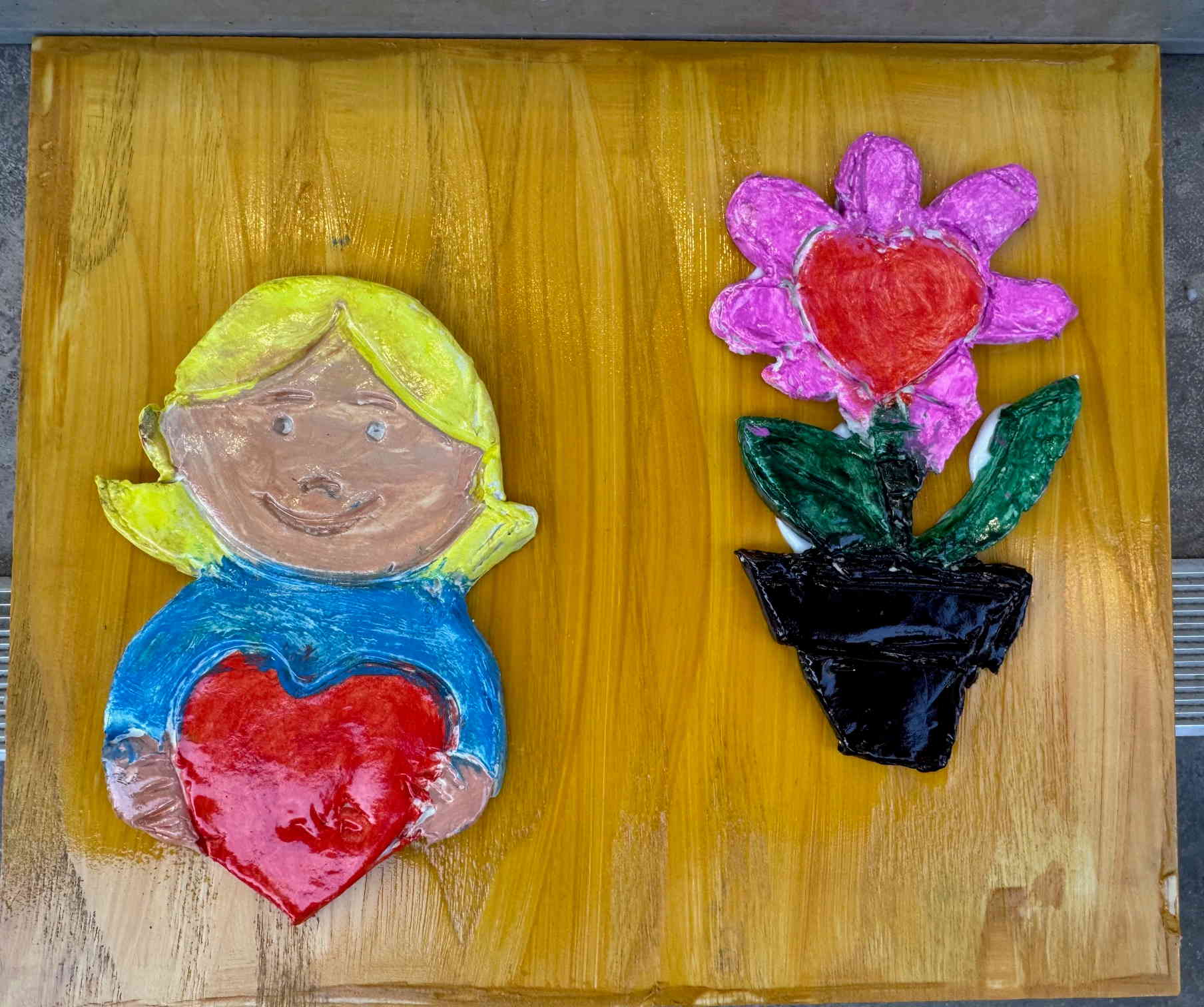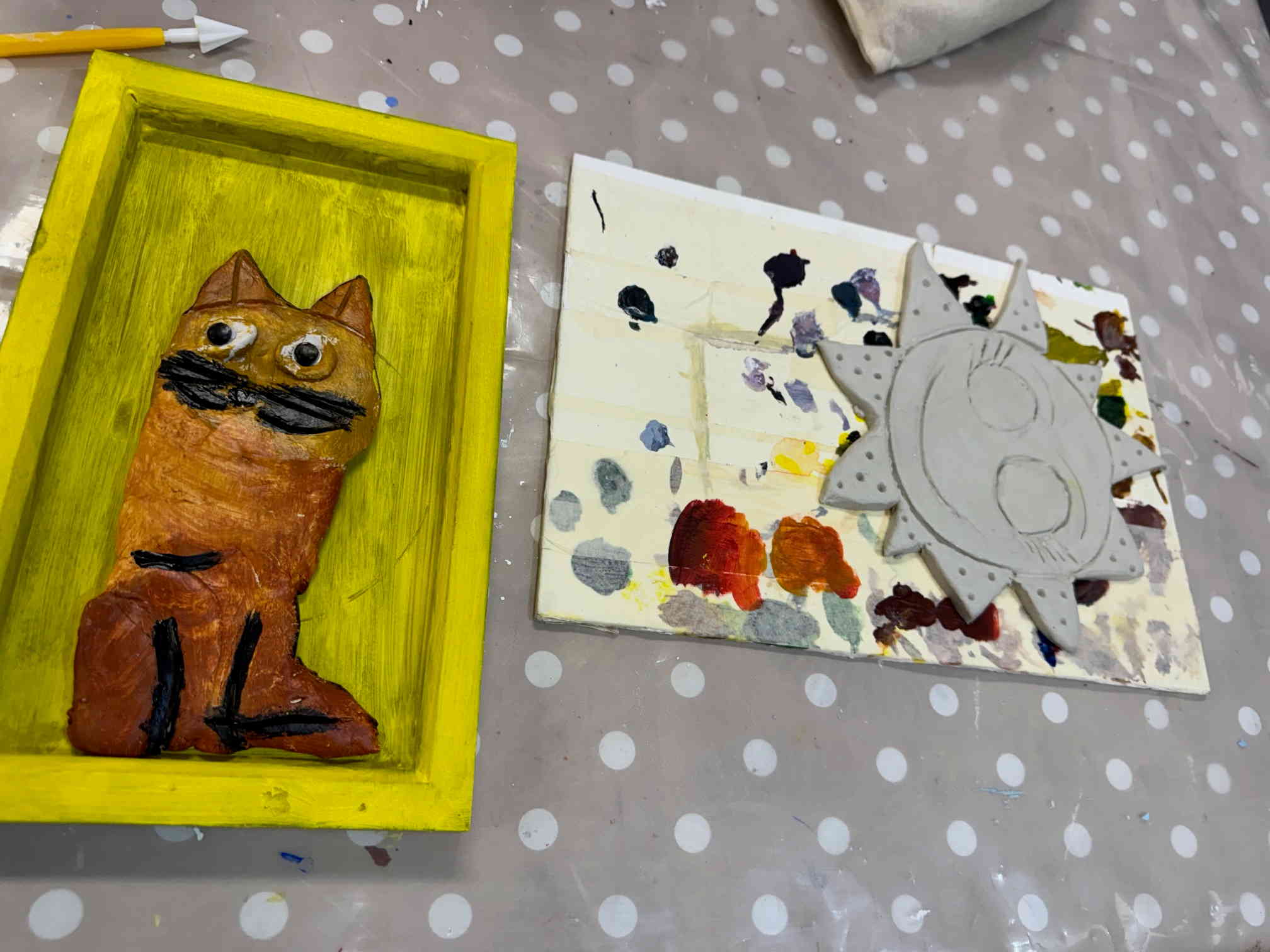 Τοποθετούμε και κολλάμε τις πήλινες δημιουργίες πάνω σε ξύλα ή καμβαδάκια και τα παιδιά έχουν επιτοίχια έργα τέχνης