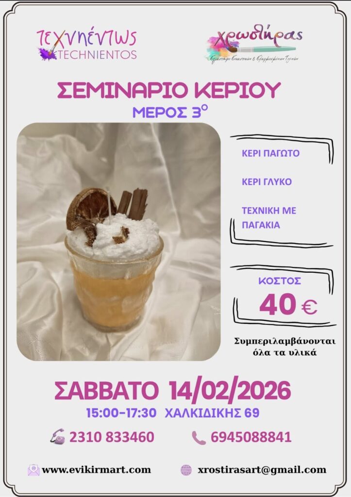ΜΠΡΑΒΟ ΜΑΣΗΡΘΑΝ ΤΑ ΧΕΛΙΔΟΝΙΑ ΚΑΙ ΕΜΕΙΣ ΤΑ ΖΩΓΡΑΦΙΣΑΜΕ ΜΕ ΧΡΥΣΟΥΣ ΗΛΙΟΥΣ ΟΛΟΚΛΗΡΩΘΗΚΕ ΤΗΝ ΤΡΙΤΗ 24 ΦΕΒΡΟΥΑΡΙΟΥ του 2026 στις 14:00-17:00 ΤΟ ΣΕΜΙΝΑΡΙΟ ΖΩΓΡΑΦΙΚΗΣ με την ΤΕΧΝΙΚΗ ΦΥΛΛΟ ΧΡΥΣΟΥΤίτλος: «ΧΕΛΙΔΟΝΙΑ»Διάσταση: 30×40εκ.Ο Χρωστήρας – πολυχώρος τέχνης & σεμιναρίων σε συνεργασία με την Κοιν.Σ.Επ «Τεχνηέντως» οργανώνει:ΣΕΜΙΝΑΡΙΑ ΖΩΓΡΑΦΙΚΗΣ για ΑΡΧΑΡΙΟΥΣ και ΠΡΟΧΩΡΗΜΕΝΟΥΣ!!!ΚΟΣΤΟΣ: 35€Στην τιμή συμπεριλαμβάνονται όλα τα υλικάΔΕΝ ΑΠΑΙΤΟΥΝΤΑΙ […]