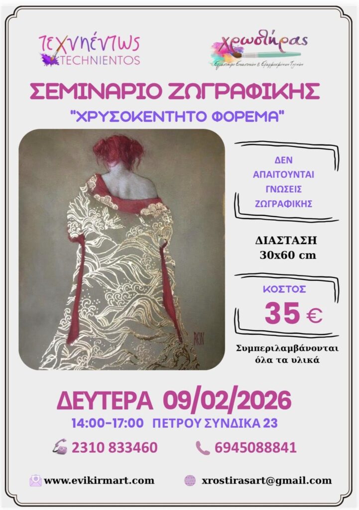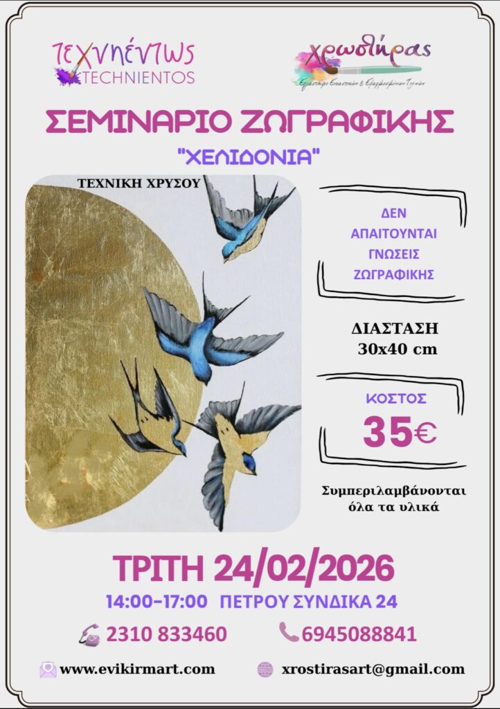 ΟΛΟΚΛΗΡΩΘΗΚΕ ΜΕ ΕΠΙΤΥΧΙΑ ΤΗΝ ΤΡΙΤΗ 10 ΦΕΒΡΟΥΑΡΙΟΥ του 2026 στις 18:30-20:30 ΤΟ ΣΕΜΙΝΑΡΙΟ ΖΩΓΡΑΦΙΚΗΣ με την ΤΕΧΝΙΚΗ της ΑΚΟΥΑΡΕΛΑΣΤίτλος: «ΔΕΝΔΡΑ ΣΤΟ ΠΟΤΑΜΙ»Διάσταση: 35×50εκ.Ο Χρωστήρας – πολυχώρος τέχνης & σεμιναρίων σε συνεργασία με την Κοιν.Σ.Επ «Τεχνηέντως» οργανώνει:ΣΕΜΙΝΑΡΙΑ ΑΚΟΥΑΡΕΛΑΣ για ΑΡΧΑΡΙΟΥΣ και ΠΡΟΧΩΡΗΜΕΝΟΥΣ!!!ΚΟΣΤΟΣ: 35€Στην τιμή συμπεριλαμβάνονται όλα τα υλικάΔΕΝ ΑΠΑΙΤΟΥΝΤΑΙ ΓΝΩΣΕΙΣ ΖΩΓΡΑΦΙΚΗΣΔηλώστε συμμετοχή στο 6945088841 Εύη ΚυρμακίδουΣε […]