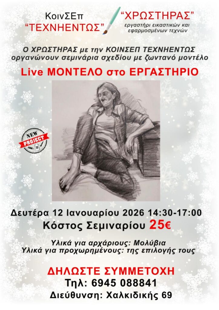 Project «LIVE ΜΟΝΤΕΛΟ στο ΕΡΓΑΣΤΗΡΙΟ» / Νέα, Χρωστήρας / Από Mary Ganda ΔΕΥΤΕΡΑ 12 ΙΑΝΟΥΑΡΙΟΥ 2026 14:30-17:00 στην Χαλκιδικής 69Δηλώστε συμμετοχή στο 6945088841ΚΟΣΤΟΣ: 25€ΧΡΩΣΤΗΡΑΣ &Κοιν.Σ.Επ ΤΕΧΝΗΕΝΤΩΣΠέτρου Συνδίκα 24Χαλκιδικής 69Πέτρου Συνδίκα 23, ΘεσσαλονίκηΟΙ ΘΕΣΕΙΣ ΕΙΝΑΙ ΠΕΡΙΟΡΙΣΜΕΝΕΣΙδιοκτήτρια: Εύη Κυρμακίδου, εικαστικός απόφοιτος της Σχολής Καλών Τεχνών του ΠΔΜ